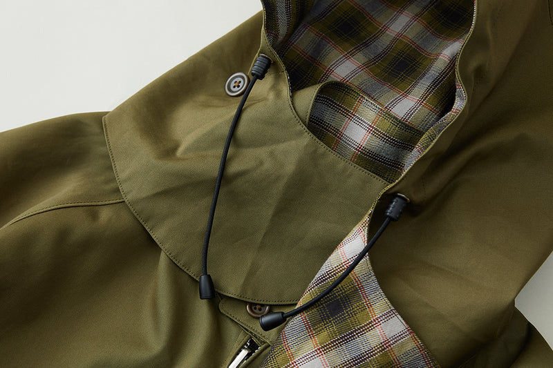 生地は撥水加工が施されたコットンナイロンを使用。経糸にはリサイクルナイロン、緯糸に上質な超長綿が高密度に打ち込まれており、化繊特有の光沢感を抑えたしなやかな上品さや、程よい軽さと機能性が共存する生地です。
