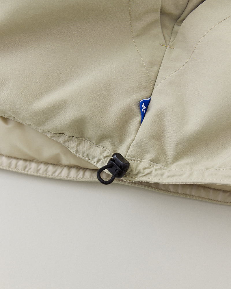 裾の両サイドにはドローコードを配備し、絞り具合でシルエットをアジャストできる仕様に。もちろんシルエットだけでなく、風の侵入を防ぐこともでき大事な役割を果たしてくれます。