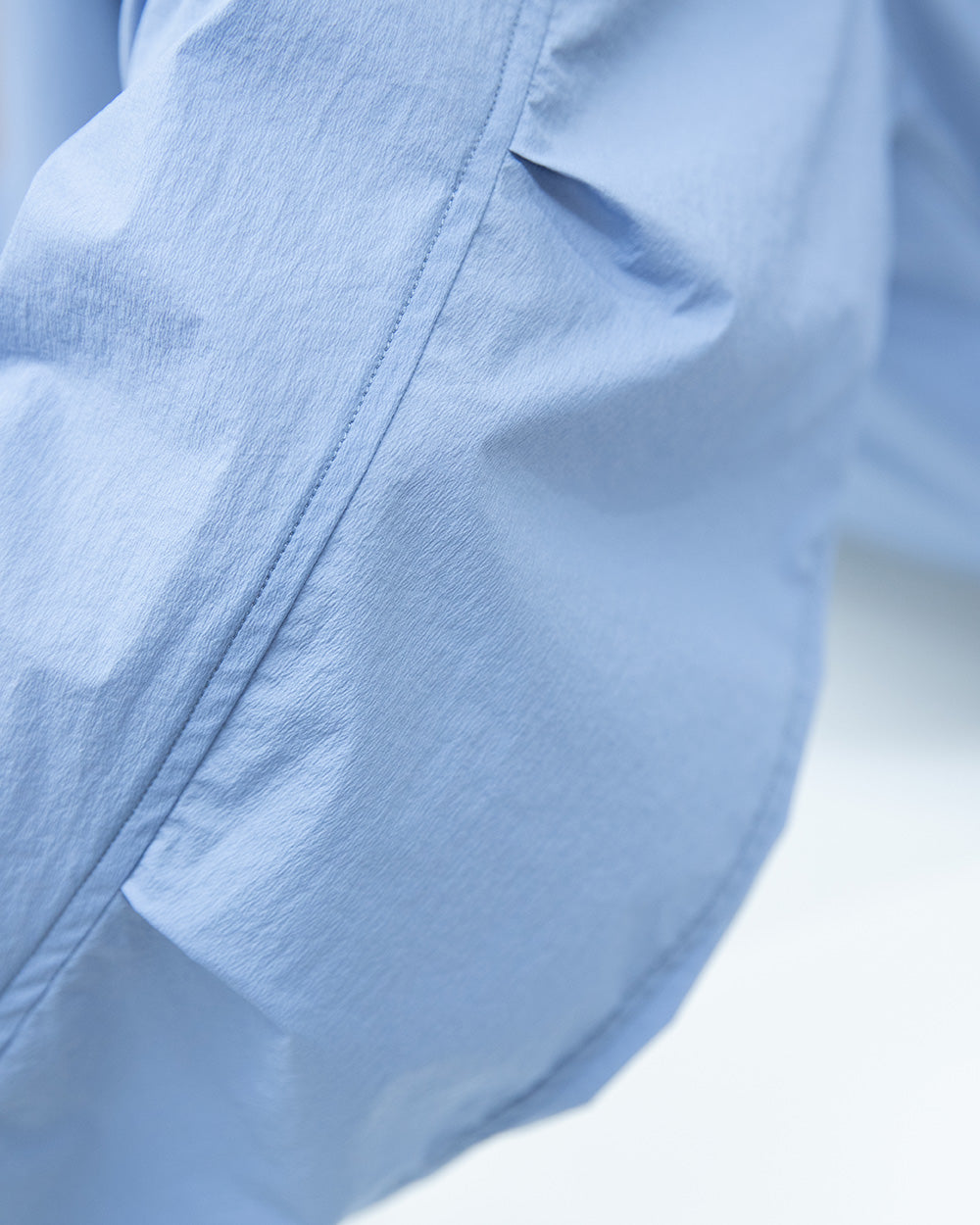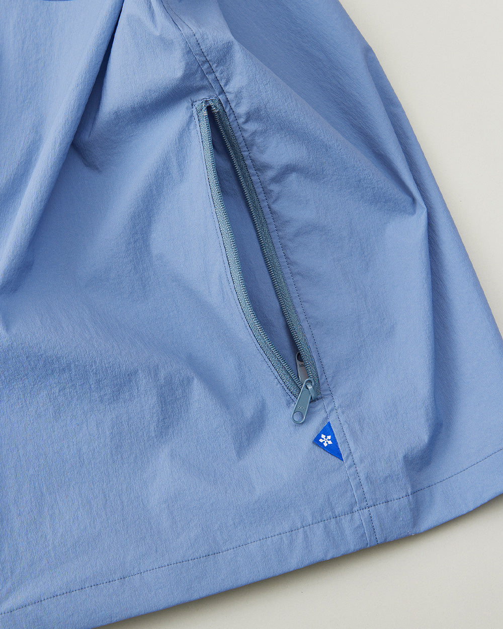 生地はナイロン素材のクリスピーナイロン。ナイロン素材であるにも関わらず、ストレッチ性と強撥水性を持っている素材です。 細番手の20デニールナイロンを使用しているので、軽量かつ動きやすさのあるアイテムに仕上がっています。