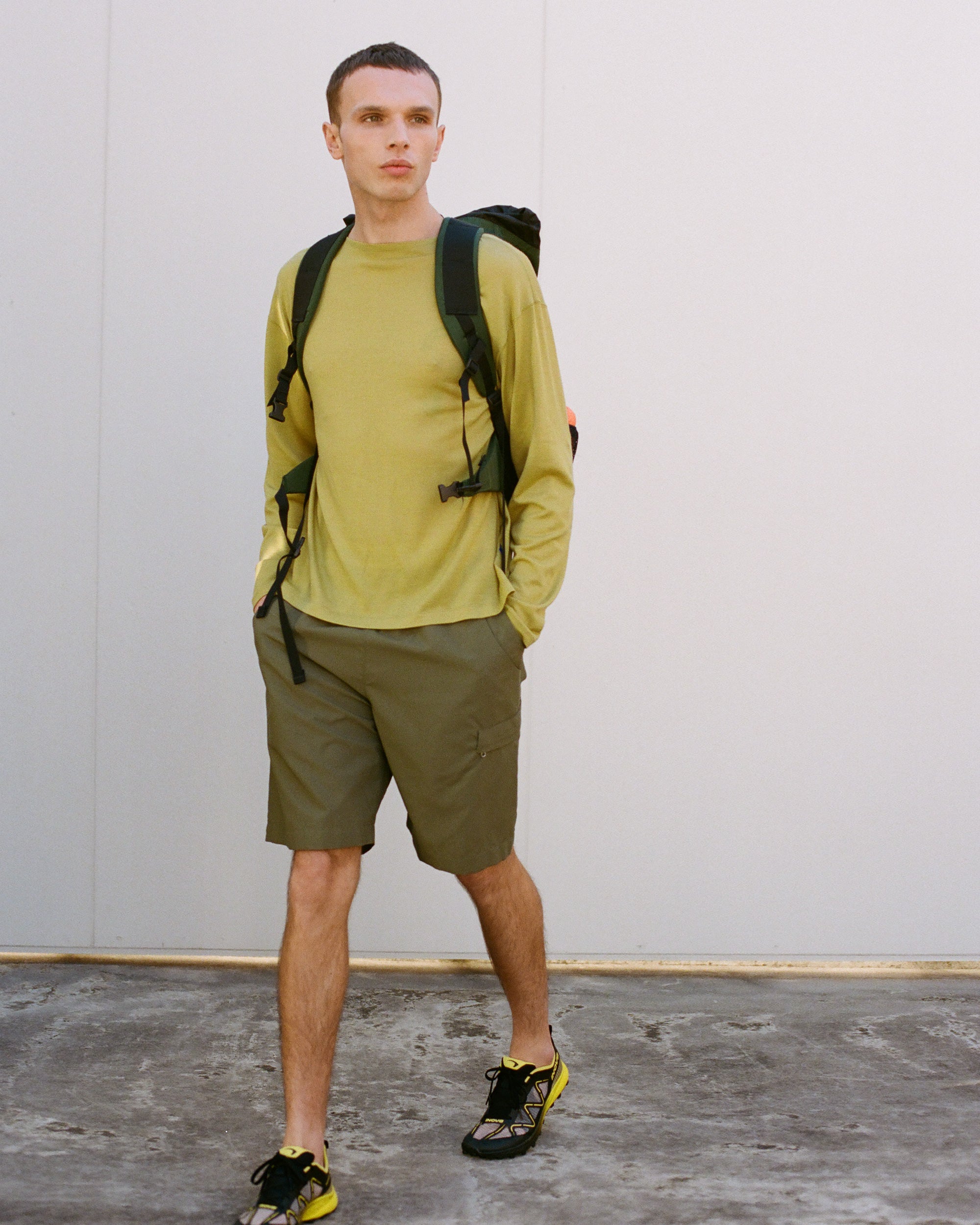 新作のRambling W-pocket Shortsと合わせた、メリノウールシャツ×化繊パンツという登山の王道スタイル。スポーティーな印象になりがちなスタイリングも、カレドアーのメリノウールTシャツなら洗練さをプラスすることができます。