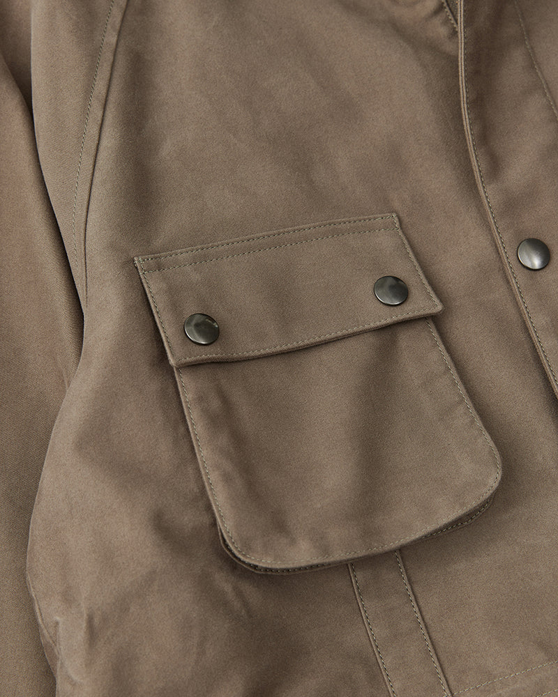 生地はカレドアーのオリジナルで制作したモールスキン。モールスキンは、80~90年代のフランスでワークジャケットに用いられていた堅牢な生地で、高密度で織られているため保温性も高いコットン生地です。スエードのようなしなやかで上質な肌触りに仕上げるため、針で掻いて風合いを出す”針布起毛”をし、生地表面に現れたループ状になった糸を平らに切りそろえる”シャーリング”を何度か繰り返す手間を施しています。そのため、柔らかな風合いがヴィンテージのようなオールド感を生み出すことができます。