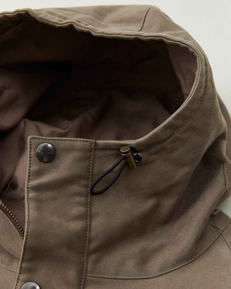 王道の4ポケットマウンテンパーカーに、60年代のイギリスで着られていたハンティングブルゾンのエッセンスを加え、化繊の生地ではなくあえて武骨でブリティッシュな印象を持たせるモールスキン素材でつくりました。保温性も高いうえに丈夫で気を遣わずに使える頼もしさがあり、しなやかで上質なスエードのような上品さも持ち合わせているためシティーでも使いやすいマウンテンパーカーです。
