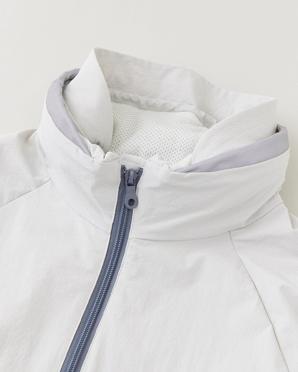 フードの仕様は90年代当時のウェアから引用しており、着用しながら織り込んで収納できるめずらしい仕様です。収納するとスタンドカラーにもなり、ライニングの高性能なメッシュ生地によって首元にあたる部分も気にならない着心地の良さ。リフレクターも備わっているため、夜間のランブリングも安心です。