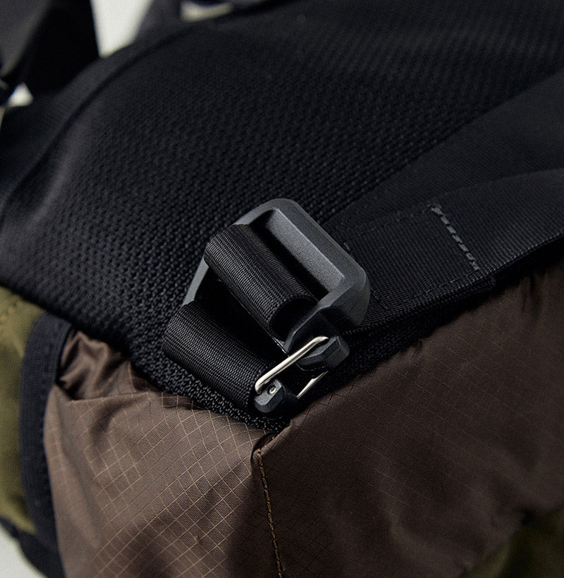さらに、プラスチックパーツやストラップにも、歩くことへのこだわりが。ミリタリー、アウトドアのギアにも活用実績のあるDURAFLEX社のクイックリリース、WOOJIN社のコードロックを使用しています。これらはワンアクションでストラップのつけ外しや、アジャスト、ロックを実現し、使い心地は快適そのもの。ショルダーストラップの素材は肌触りの良いウェットスーツ風の生地を用いているため、歩いている内に負荷のかかりやすい干渉部分を優しくサポートしてくれます。